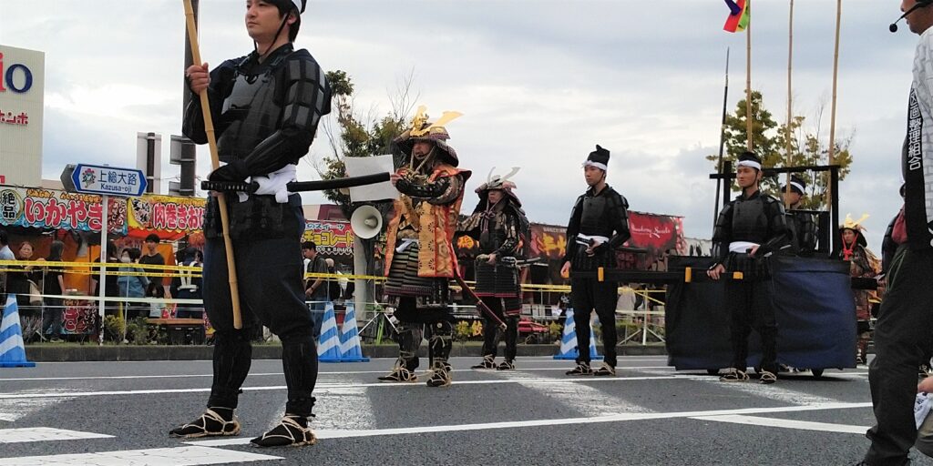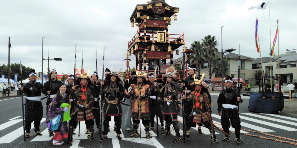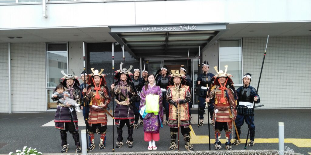 2025.10.4に行われた上総いちはら国府祭りにて恒例のオープニングイベント『時代絵巻行列、山鉾・山車の巡行』当院の有志13名が参加してきました。今年は雨予報の中イベント参加中は雨が止み、無事大役を果たせました。祭りのあと毎年恒例と病院の正面玄関にて患者様へお披露目させて頂きました。