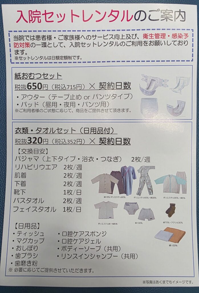 衛生管理・感染予防の観点から、入院セットのご利用をお願い申し上げます。